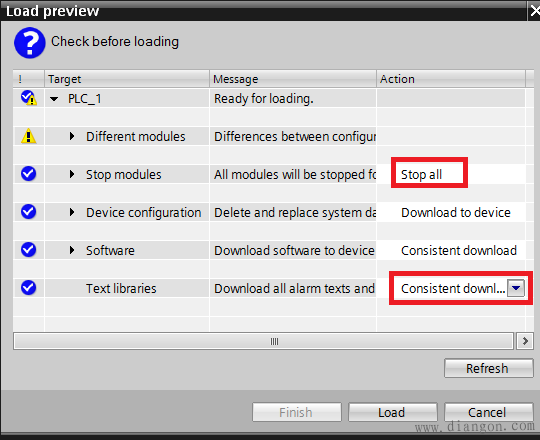 | 5 | 项目数据必须一致。如果项目没有被编译,在装载前项目数据会自动被编译。在“装载预览”对话框中,显示出要执行的装载信息和动作要求。