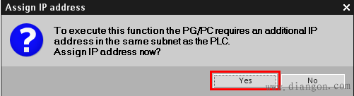 | 4 | 编程设备的以太网口 IP 地址必须和被组态的模板在相同的 IP 网段。如果为 PG/PC 已经分配了一个 IP 地址,将不会出现图.04 的对话框。点击“Yes”按钮。