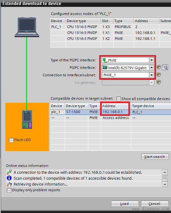 | 2 | 第一次下载时,会弹出“扩展下载到设备”对话框。这里需要定义 PG/PC 接口。在下拉列表中可以选择已组态的数据并点击“下载”按钮。