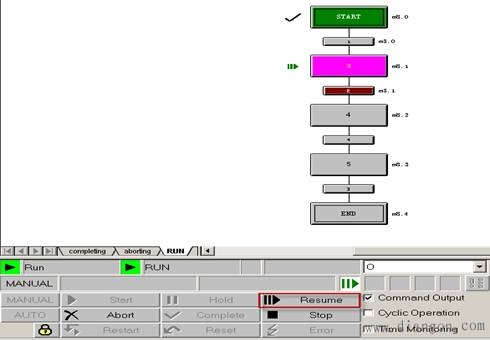 ・Retain SFC state:记录SFC chart的状态,CPU重启后顺控程序保持在重启前的控制步,由操作员来决定SFC chart的执行。如下图2所示,由操作人员来决定SFC chart的工作状态,点击Resume按钮后顺控程序继续向下执行,也可以通过Stop和Abort按钮转换SFC chart的状态执行。