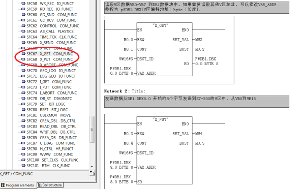 例子程序在OB1当中调用数据读写功能块:SFC67和SFC68,如下图:  图3 程序编写