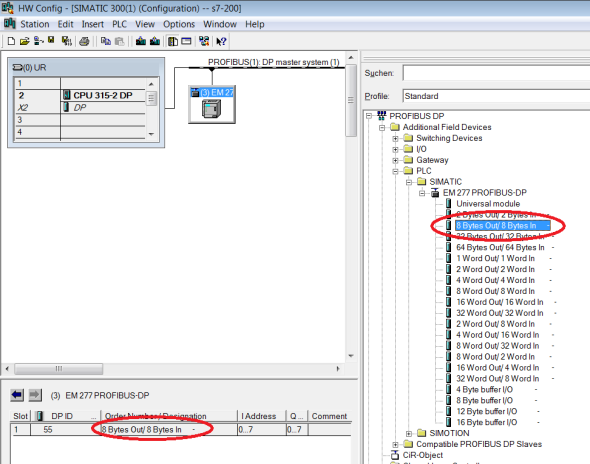 导入GSD文件后,在右侧的设备选择列表中找到EM277从站,PROFIBUS DP®Additional Field Devices®plc®SIMATIC®EM277,并且根据通讯字节数,选择一种配置,本例选择8字节入/8字节出的方式,如下图: