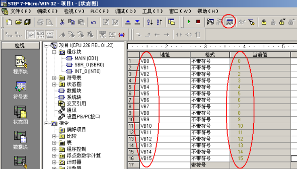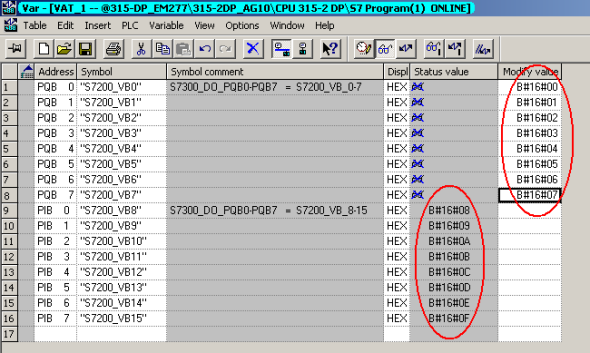 组态完系统的硬件配置后,将编译下载到S7-300的PLC当中。S7-300的硬件下载完成后,将EM277的拨位开关拨到与以上硬件组 态的设定值一致,在S7-200中编写程序将进行交换的数据存放在VB0-VB15,对应S7-300的PQB0-PQB7和PIB0-PIB7,打开 STEP7中的变量表和STEP7 MicroWin32的状态表进行监控,它们的数据交换结果如下图: