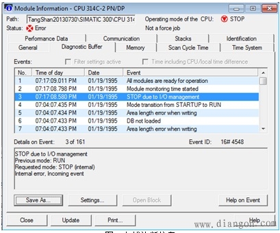 从诊断信息情况看,应该是CPU在瞬间无法识别其模板,导致CPU进入停机状态。