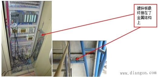 同时,在柜内,我们发现了一块镀锌板(图5)。我们估计该镀锌板是用于系统接地的,但实际情况是,并没有任何的PLC系统接地线连到该镀锌板上,也没有发现该镀锌板接到外部的“地”(图5)。