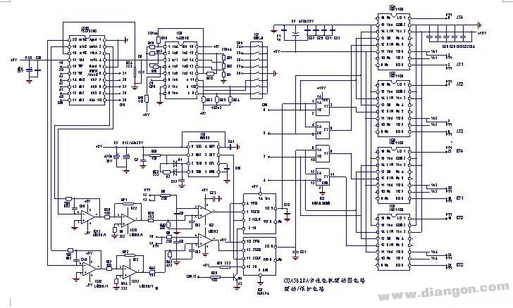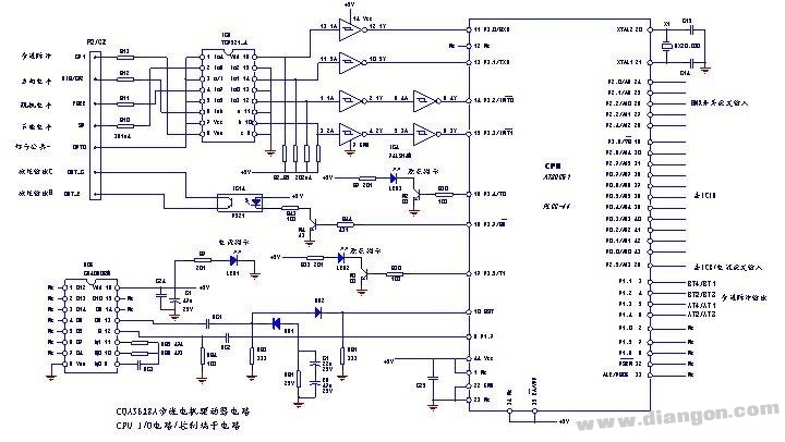 第四张图:CPU(单片机)电路和控制端子内电路图。步进电机驱动器是由单片机生成四路脉冲信号,经后续电路驱动功率输出电路,进而驱动步进电机的。该图将单片机的O/I口都详细标出,便于进行分析原理和故障检测。控制端子,除步进脉冲和方向电平信号输入外,还提供步进驱动器的故障信号输出,用于故障状态的显示等。