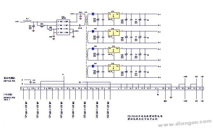 第二张图:驱动电源及端子信号来源。由电源板来的+15V电源,经NE555时基电路振荡逆变,开关变压器PT1四个次级绕组输出四组互相隔离的15V直流电压,供驱动IC的供电;
