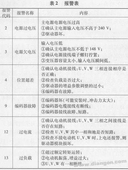此外,还可以利用报警表(表2)提示来处理故障。