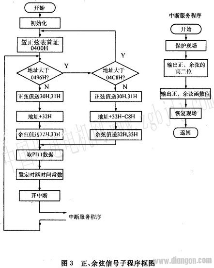 将此值转换为16进制数,加上偏移码,即得某一正弦函数的数字量,对于双极性的10位D/A转换器,偏移码为0200H,即此值AD7520双极性输出为零伏。正弦、余弦信号子程序框图如图3所示。
