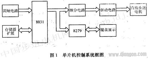 所设计的样机是二相混合式直线步进电动机,在绕组A和B分别通过正弦、余弦电流,步进电动机即能正常运行。整个控制系统可分成调频电路、细分电路、驱动电路、键盘显示电路、存储器扩展电路等部分,如图1所示。
