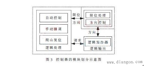 步进电机在具有一定转换方向的驱动脉冲下运行,据此将电机控制器划分为方向控制和逻辑输出两个部分。限位信号用于复位和限定运行方向,因此在方向控制部分同时处理限位;在逻辑输出部分,按照控制需求再次划分为复位、自动和手动三个逻辑处理模块,在逻辑输出的实现方式上,复位、自动和手动通过一定的优先级逻辑,通过发送电机占用请求复用逻辑输出模块。图3为控制器模块划分示意图。