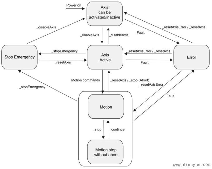 1.Axis inactive / can be activated 轴未使能,可以被使能 2.Axis active 轴已使能 3.Motion 轴在运动中 4.Fault 轴出现故障 5.StopEmergency 轴紧急停止 中的各状态之间的关系如下图所示。 图01. SIMOTION轴的状态模型 SIMOTION中轴的当前状态可以通过以下系统变量进行查看,以Axis_1为例。 1.Axis inactive / can be activated _to.Axis_1.Control = inactive 2.Axis active _to.Axis_1.Control = active 3.Motion _to.Axis_1.motionStateData.motionCommand = IN_MOTION 4.Fault _to.Axis_1.error = 1 and _to.Axis_1.ErrorReaction <> NONE 5.StopEmergency _to.Axis_1.stopEmergencyCommand.state = active 轴的各状态详细解释如下: 1.Axis in inactive / can be activated 该状态下,轴未使能,所以运动命令不会被执行,驱动器没有输出,电机可以自由转动,轴的设定位置和实际位置都会随电机的转动而变化。 另外,轴的命令缓冲区被清空,系统变量可以恢复为配置数据或起始数据。此时,使用_enableAxis()或_enableQFAxis()命令可以使能轴,轴的状态也会变成使能状态(2.Axis Active)。其中_enableAxis()用于使能电气轴,_enableQFAxis()用于使能液压轴。 2.Axis active 该状态下,轴已使能,轴的各种运动命令可以执行。在运动命令执行过程中,轴的状态会变成运动中(3.Motion);在运动命令执行完成后,会返回到使能状态。 3.Motion 该状态下,轴的运动命令处于执行中。运行中的运动命令可以使用_stop()命令停止,在其停止模式stopMode设为STOP_WITHOUT_ABORT时,可以使用_resume()命令继续之前的运动;在其停止模式StopMode设为STOP_AND_ABORT时,命令完全中止,轴会返回到使能状态(2.Axis Active)。 4.Fault 在轴命令执行过程中,如果发生错误,比如限位到达、跟随误差太大等,会触发相应的工艺报警,轴会按工艺报警默认的方式作出响应,并进入错误状态。在使用SIMOTION SCOUT软件在线连接设备时,可以在报警窗口中查看工艺报警的信息。工艺报警的响应方式可以在报警配置中修改,具体方法可以参考下载中心文档《SIMOTION 工艺对象 Alarm 配置》,文档编号:F0693。 如果错误已排除,那么可以在SIMOTION SCOUT软件的报警窗口中直接点击“Acknowledge”按钮确认;另外,也可以在程序中调用_resetAxis()或_resetAxisError()命令来确认。 工艺对象的报警信息也可以在hmi设备上显示和确认,具体方法可以参考下载中心文档《如何在HMI上显示Simotion 工艺对象的报警信息》,文档编号:F0460。 5.StopEmergency 在SIMOTION中为轴提供了一种StopEmergency的状态,该状态下轴仍处于使能状态,但不允许执行运动命令,轴是静止的。由于轴仍处于使能状态,它会克服由负载造成的电机轴的意外转动,从而能起到一定保护作用。 通过调用_stopEmergency()命令,可以使轴进入StopEmergency状态。该状态下,插补器中激活的命令被中止。 该状态可以通过调用_disableAxis()、_disableQFAxis()或_resetAxis()命令来取消。其中_disableAxis()用于电气轴去使能,_disableQFAxis()用于液压轴去使能。