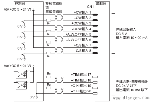 图3 RKD514L-C驱动器控制端子(经附件端子排)接线图