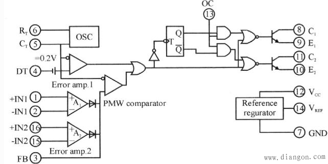 MB3759芯片内部电路主要由高频振荡器、PWM比较器、基准电压源、误差电压放大器、驱动电路和封锁电路等组成。控制芯片内部有2个电压比较器,管脚1、2和15、16是电压比较器正负输入端子,管脚3是电压比较器统一输出端。同时误差放大器的输出也可开放给用户,用户可以根据需要设计成PI控制器。管脚5、6可接振荡电容和电阻,振荡器的振动频率由外接电阻和电容决定。管脚8为触发脉冲输出口,采用电流图腾柱输出,使得芯片可以直接驱动功率不大的开关管。(原文来自:http://www.diangon.com/)T触发器的作用是将输出进行分频,得到占空比为50%的频率为振荡器频率的l/2的方波,将T触发器输出的这样两路互补的方波同比较器输出PWM信号进行“或非”运算,就可以得到两路互补的占空比为O~50%的PWM信号,考虑死区时间的存在,最大占空比通常为45%~47.5%。管脚13为封锁控制,管脚14为参考电压,管脚12为工作电压,管脚4为死区控制端,一旦高电平输入,芯片输出脉冲被封锁,直流电压输出为零。