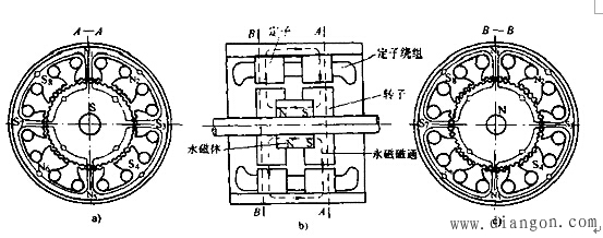 混合式步进电动机由定子和转子组成。定于铁心与反应式步进电动机相同,每个极上有小齿和控制绕组。转子的结构与水久磁钢的电磁减速式同步电动机相同。以两相混合式步进电动机为例,其结构原理如图1所示。