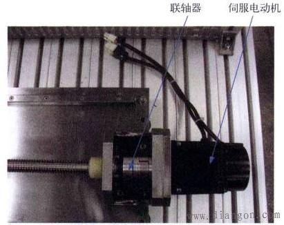 电动机是机械十字滑台的动力源,电动机通过联轴器与滚珠丝杠相连接,带动丝杠一起旋转,丝杠螺母将旋转运动转换为直线运动,驱动移动平台在直线导轨副上做直线往复运动。图所示伺服电动机与联铀器实物装配的全貌。