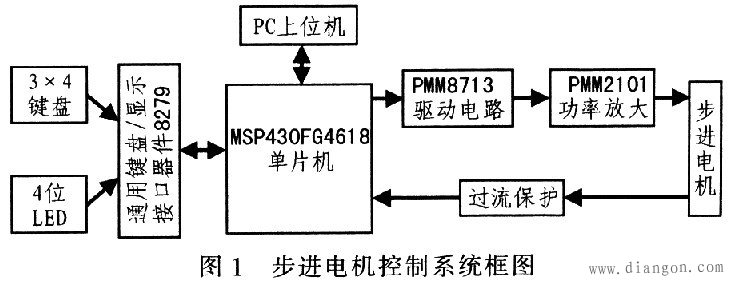 单片机模块主要由MSP430FG4618单片机及外围滤波、电源管理和晶振等电路组成。MSP430FG4618单片机内部的8 KB RAM和116 KB Flash满足控制系统的存储要求,P1和P2端口在步进电机工作过程中根据按键状态判断是否跳入中断服务程序来改变步进电机的工作状态,USART模块实现单片机和PC上位机之间的通信,实现PC机对步进电机控制。电源管理电路提供稳定的3.3 V和5 V电压,分别给单片机、晶振电路和驱动和功率放大电路供电。32 kHz晶振给单片机、键盘/显示接口器件8279和脉冲分配器PMM8713提供时钟;当采用USART模块时需开启8MHz晶振设置通信模块。图2为单片机模块结构框图。