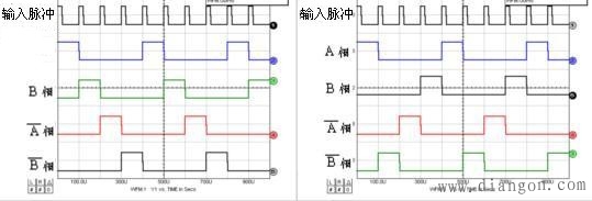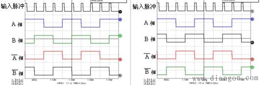 此种激磁方式又称1-2相激磁,激磁一相线圈和二相线圈交互进行,每加入一数字脉波所转动之角度为原步进角的一半,因此分辨率可提高一倍,且运转时相当平滑,故与2相激磁方式同受广泛使用。图5为二相步进马达采用1-2相激磁方式之时序图,由图中可知,若依照A→AB→B→BA→A→AB→B→BA→A→AB……相的顺序激磁,则步进马达将以顺时针方向旋转;但如果依照BA→A→AB→B→BA→A→AB→B→BA……相顺序激磁,则马达逆时针方向旋转