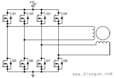 双极性型(bipolar) :定子磁极极性为两个方向,如永久磁铁式步进马达,其转子的极性和定子磁极极性有交互变化的需要。单一激磁线圈时其激磁方向为正负交替变化,两组磁极线圈时,一组正向激磁,另一组负向激磁,两组交替变化,使定子磁极极性变化。以双极方式运用,其电源较为复杂。双极性步进电机的驱动电路则如图2所示,它会使用八只晶体管来驱动两组相位。双极性驱动电路可以同时驱动四线式或六线式步进电机,虽然四线式电机只能使用双极性驱动电路,它却能大幅降低量产型应用的成本。双极性步进电机驱动电路的晶体管数目是单极性驱动电路的两倍,其中四颗下端晶体管通常是由微控制器直接驱动,上端晶体管则需要成本较高的上端驱动电路。双极性驱动电路的晶体管只需承受电机电压,所以它不像单极性驱动电路一样需要箝位电路。