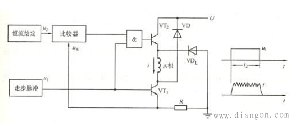 斩波恒流功率驱动接口也有两个输入控制信号,其中u1是数字脉冲,u2是模拟信号。这种功率接口的特点是:高频响应大大提高,接近恒转矩输出特性,共振现象消除,但线路较复杂。目前已有相应的集成功率模块可供采用。