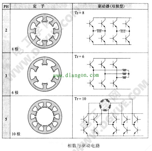 下图为不同相数的步进电机典型定子结构和驱动电路的比较,其中忽略了转子结构图。假设转子均为PM型或HB型,并且依据定子为两相、三相、五相等配备相应的转子。定子采用不产生不平衡电磁力(在后面会详细介绍,转子径向吸引力的和不能完全互相抵消,产生剩余径向力)的最小主极数结构,即两相为4个主极、三相为3个主极、五相为5个主极时,结构上会产生不平衡电磁力,除特殊用途外不会使用上述结构。图中,定子的结构为两相为8个主极、三相为6个主极、五相为10个主极,为最简单的结构。