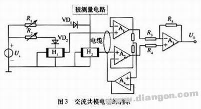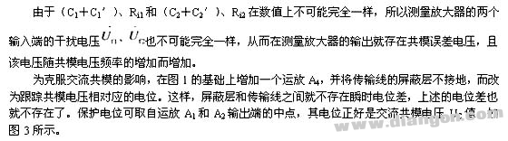 所取的电位经运放A4组成的电压跟随器驱动电缆的屏蔽层,这样就较好地抑制了交流共模电压的干扰。图3所示的电路,适用于各种传感器电路。 |