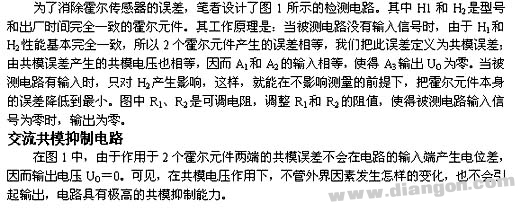 霍尔传感器以无触点,体积小,结构简单等优点,在电测、自动控制和计算装置等方面得到了广泛应用。由于霍尔传感器产生误差的原因多,目前虽然采取了各种补偿措施,但仅用一种补偿电路很难有效地对各种误差进行补偿。为此,本文设计了一种电路,不用补偿电路就能有效地对各种误差进行补偿。 主要误差及产生原因 1.零位误差 零位误差是由不等位电势所造成的。产生不等位电势的主要原因是:2个霍尔电极没有安装在同一等位面上;材料不均匀造成电阻分布不均匀,控制电极接触不良,造成电流分布不均匀等。 2.寄生直流电势误差 产生寄生直流电势的主要原因是:控制极与霍尔极元件接触不良,形成非欧姆接触;2个霍尔电极大小不对称,使2个电极的热容量不同,散热状态不同,两极间出现温差电势,使霍尔元件产生温漂所致。 3.感应零位电势误差 霍尔元件在交流或脉动磁场中工作时,即使不加控制电流,由于霍尔极分布不对称,霍尔端也有一定输出,其大小正比于磁场的脉动频率、磁感应强度的幅值和两霍尔电极引线构成的感应面积。 4.自励磁场零位电势误差 当霍尔元件通以控制电流时,此电流也会产生磁场,称自励磁场。当电极引线不对称时,元件两边磁感应强度不相等,将有自励场的零位电势输出。 5.温度误差