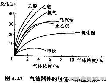 图4.42所示为典型气敏元件的阻值一浓度关系。可以看出,元件对不同气体的敏感程度不同,如对乙醚、乙醉、氢气等具有较高的灵敏度,而对甲烷的灵敏度较低。一般地,随着气体的浓度增加,元件阻值明显增大,在一定范围内,呈线性关系。