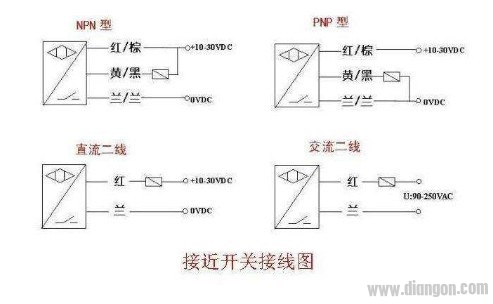 1)接近开关有两线制和三线制之区别,三线制接近开关又分为NPN型和PNP型,它们的接线是不同的。请见下图所示: 2)两线制接近开关的接线比较简单,接近开关与负载串联后接到电源即可。 3)三线制接近开关的接线:红(棕)线接电源正端;蓝线接电源0V端;黄(黑)线为信号,应接负载。负载的另一端是这样接的:对于NPN型接近开关,应接到电源正端;对于PNP型接近开关,则应接到电源0V端。 4)接近开关的负载可以是信号灯、继电器线圈或可编程控制器plc的数字量输入模块。 5)需要特别注意接到PLC数字输入模块的三线制接近开关的型式选择。PLC数字量输入模块一般可分为两类:一类的公共输入端为电源0V,电流从输入模块流出(日本模式),此时,一定要选用NPN型接近开关;另一类的公共输入端为电源正端,电流流入输入模块,即阱式输入(欧洲模式),此时,一定要选用PNP型接近开关。千万不要选错了。 6)两线制接近开关受工作条件的限制,导通时开关本身产生一定压降,截止时又有一定的剩余电流流过,选用时应予考虑。三线制接近开关虽多了一根线,但不受剩余电流之类不利因素的困扰,工作更为可靠。 7)有的厂商将接近开关的“常开”和“常闭”信号同时引出,或增加其它功能,此种情况,请按产品说明书具体接线。注:标识含义: bk(black)黑色:一般为输出线,输出为常开。 bn(brown)棕色:一般为电源线,接电源正极。 bu(blue)蓝色:一般为电源线,接电源负极。 wh(white)白色:一般为输出线,输出为常闭。 npn:黑色一端接负载,负载另外一端接电源正极。 pnp:黑色一端接负载,负载另外一端接电源负极。 槽型光电开关接线 光电开关那个二极管是发光二极管,输出则是光敏三极管,C就是集电极,E则是发射极。 一般三极管作开关使用时,通常都用集电极作输出端。 一般接法:二极管为输入端,E接地,C接负载,负载的另一端需要接正电源。这种接法适用范围比较广。 特殊接法:二极管为输入端,C接电源正,E接负载,负载的另一端需要接地。这种接法只适用于负载等效电阻很小的时候(几十欧姆以内),如果负载等效电阻比较大,可能会引起开关三极管工作点不正常,导致开关工作不可靠。