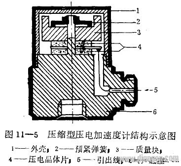 压电加速度计的结构型犬有压缩型、剪切型和弯曲型三种,图11―5为压缩型加速度计结构示意图.其敏感元件是压电晶体片4,晶体片上压一个质量块3,用一个刚度较大的弹簧2对这个质量块施加一个预紧力,并将它们绽在一个带有厚的基座6的金属外壳1内.当加速度计安装在被测扳动物体上而随之板动时,质量块就产生一个正比于振动加速度的力作用在压电晶体片上,根据正压电效应,在晶体片两相对的表川上就产生交变的电材,共大小与作用力成正比,田质量块的质量固定不变,所以晶体片上的电荷与扳动加速度成正比.