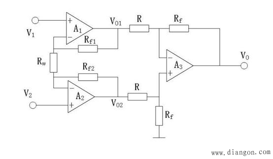 图1为三个运放组成的测量放大器,差动输入端V1和V2分别是两个运算放大器(A1、A2)的同相输入端,因此输入阻抗很高。采用对称电路结构,而且被测信号直接加入到输入端上,从而保证了较强的抑制共模信号的能力。A3实际上是一差动跟随器,其增益近似为1。图2为AD522典型接法。
