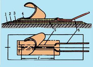 1、3粘合层 2、基底 4、盖片 5、敏感栅 6、引出线