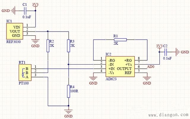 PT100是一种正温度系数的热敏电阻。说到什么是正温度系数?就必须要结合负温度系数来讲了。随着温度的升高,电阻的阻值变大,就是正温度系数的热敏电阻,相反,如果随着温度的升高,电阻的阻值变小,就是负温度系数的热敏电阻。 PT100之所以应用很广泛,不仅是因为它可以测的温度范围宽(零下几十度到零上几百度),还因为它的线性度非常好。“线性度”,说的直白一点就是温度每变化一度,电阻的阻值升高的幅度是基本相同的。这样,就大大的简化了我们的程序。 不过,PT100也有它的缺点,就是温度每上升一度,阻值变化太小了,只有0.39欧姆。这样就需要硬件上提供高精度低噪声的转换。 网上流传有很多电路,很多电路其实都是不能当作产品用的。下面给大家提供一种高精度的电路,就是成本有些高,不过品质好。 对于测温电路,其实有很多可以值得研究的地方,小电路有大智慧。比如,你可以一眼就看出来这个电路不能测零下的温度吗?你可以计算出来这个电路可以测量的温度范围是从多少度到多少度吗?你可以修改这个电路,让它可以测到你所需要的温度范围吗?如果把反相(-IN)和同相(+IN)两条线调换,后果如何? 看看,你觉得电路简单,那么上面的问题都可以回答吗? 电路解释: 越简单的电路,稳定性就越好。该电路中的四个电阻都需要用0.1%精度的。电路只用了一个电桥和一个差分放大器。R2 R3 R4与PT100组成电桥电路,REF3030为电桥电路提供标准的3.00V电压。AD623用一个2K的放大反馈电阻精确的把电桥的压差放大51倍。(为什么是51倍,详见AD623的datasheet) PT100接法: 细心的小伙伴,会研究一下PT100的接法。PT100一般有两线和三线的传感器。因为线本身肯定有电阻,而上面也提到过,每变化一度,PT100只变化0.39欧姆,那么如果PT100的线很长的话,电阻就越大,线不同,电阻就不同,就肯定会大大的影响测出来的结果。所以,你现在就可以理解了,两线制的PT100,只适合短距离的应用。长距离的应用,就要用三线制。再让我们看看三线制是如何把电线上的电阻影响排除的。算了,还是下篇再讲吧,这个要画几个图才讲的清楚,时间不早了,懒得画了。 测温范围: 假设现在是0度,那么PT100的阻值就是100欧姆,在电路中的话,电桥的压差就是0V,所以最后也是0V,也就是测到0V的话,就是0度。假设现在零下一度了,PT100的阻值就小于100欧了,同相的电压就会比反相的电压小,得到的电压永远就0V了,所以这个电路就测不到0度以下。 AD623最大输出3.3V电压,3300/51=64.7mV,也就是说,电桥的压差,最大只能是64.7mV,再大的压差,AD623的输出也最大是3.3V了。反相臂的电压,固定是(3000/2100)*100=142.86mV,那么同相臂的电压最大只能是142.86+64.7=207.56mV,对应PT100的电阻就等于207.56/((3000-207.56)/2000)=148.66欧姆。 然后再查表,就可以看出,最大测温点差不多就是个127度。所以这个电路的测温范围就是0~127度。 |