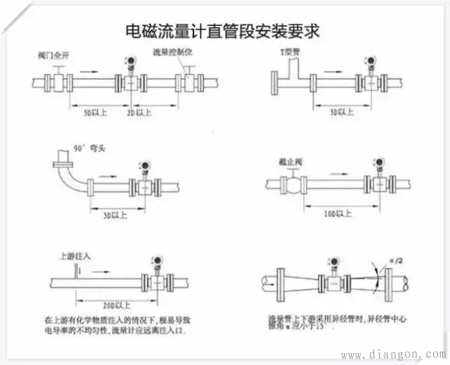 ⑦为了避免流速分相对测量的影响,流量调节阀应设置在传感器下游。对于小口径的传感器来说,因为从电极中心到流量计进口端的距离已相当于好几倍直径D的长度,所以对上游直管可以不做规定。但对口径较大的流量计,一般上游应有10D以上的直管段,下游一般应有5D以上的直管段,实在环境艰苦,也得保证前5后3。