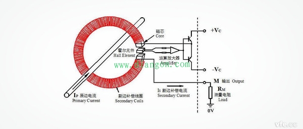 当原边电流IP流过一根长导线时,在环形磁芯中产生一磁场,这一磁场的大小与流过导线的电流成正比,产生的磁场聚集在磁环内,通过磁环气隙中霍尔元件进行测量并放大输出,其输出电压VS按比例的反映原边电流IP。