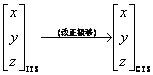 由于极移的影响,观测历元t的瞬时地球坐标系(ITS)相对于协议地球坐标系(CTS)产生旋转。假设(x, y, z)CTS和(x, y, z)ITS分别为P点的协议地球坐标和观测历元t的瞬时地球坐标,则它们的转化可以简单表示如下。