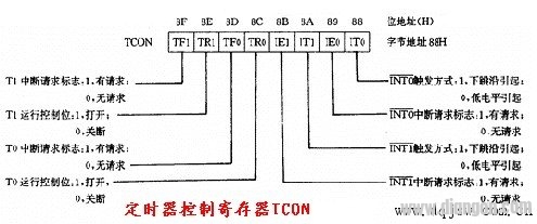 TCON在特殊功能寄存器中,字节地址为88H,位地址(由低位到高位)为88H一8FH,由于有位地址,十分便于进行位操作。