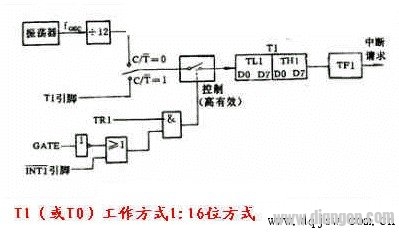 图中,C/T为定时/计数选择:C/T=0,T1为定时器,定时信号为振荡周期12分频后的脉冲;C/T=l,T1为计数器,计数信号来自引脚T1的外部信号。