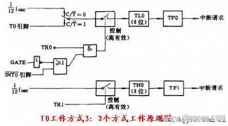 当T0为工作方式3时,THo和TL0分成2个独立的8位计数器。其中,TL0既可用作定时器,又可用作计数器,并使用原T0的所有控制位及其定时器回零标志和中断源。TH0只能用作定时器,并使用T1的控制位TRl、回零标志TFl和中断源,见下图。