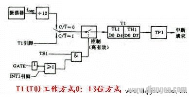 13位方式由TL1的低5位和TH1的8位构成13位计数器(TL1的高3位无效)。工作方式0的结构见下图:
