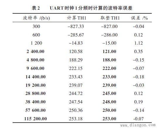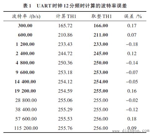 以STC12C5620为例,当采用片内RC振荡,时钟频率通常在5.2~6.9 MHz 之间。当时钟频率为5.2 MHz,SMOD=1时,UART时钟分别按12T,1T 计算,见表1,表2.
