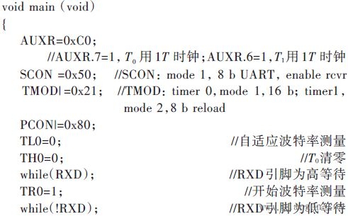从机查询RXD引脚的电平,检测到低电平后就启动定时器0开始计时,再检测到高电平就停止定时器0计时,根据定时器0的定时值就可以计算出主机的波特率。