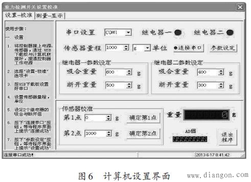 设置时,将重力检测开关与计算机之间用RS 232线连接好,然后点击PC机软件界面上的“连接串口”按钮进行波特率自适应,当界面上状态栏提示“连接串口成功!”时,表示波特率自适应工作正确完成, 如图6所示,可以进行参数设置和校准操作。设置、校准后,重力检测开关就可脱机正常工作了。