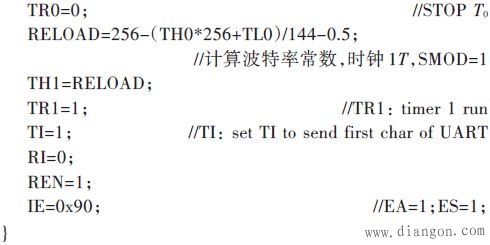 从机UART在模式1下,将式(4)或式(6)计算结果作为定时器1重装值,设定通信参数,通过串口回送应答信号给主机。主机如正确接收到从机回送的信号,就说明从机已完成波特率自适应,可以开始正常通信了。