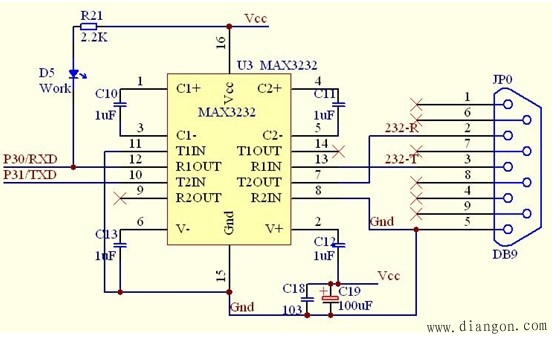 MAX3232芯片在这里完成电平转换的任务,它一边接单片机的全双工异步串行通信口,一边接PC机的RS232串口,实现两者不同的电平需要(单片机电平在0-5V,逻辑1的电平为5V、逻辑0的电平为0V;RS232电平在±15V,标准规定:逻辑1的电平为-3~-15V、逻辑0的电平为+3~+15V)。接一只发光管D5,可在通讯时看到它闪闪发光,增加点气氛,别无它意。