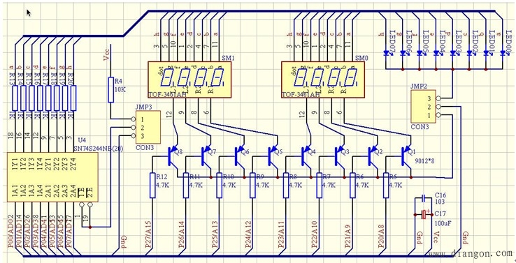 由图3可看出,该电路用到了单片机的P0口和P2口,P0口经芯片U4(74LS244)驱动后送发光管的阳极和数码管的段选口,JMP3跳线插排的默认位置是2、3脚短接,U4使能;若将1、2脚短接,则U4不使能;P2口通过8只PNP型三极管与数码管的位选口相连,加大拉电流的能力(数码管是共阴极的,型号是TOF-3461AH);跳线JMP2可选择接地,1、2脚短接则将8只三极管的集电极接地,可做数码管实验,2、3脚短接则将发光管的阴极接地,可做发光管的实验。当然,若U4不使能,发光管和数码管都不会显示。