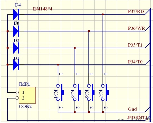 为了以后学习简单按键输入技术以及外部中断扩展技术的方便,在本最小系统里另外设计了4个按键,如图5所示,若短路JMP1的1、2脚,可扩展外部中断;若断开1、2脚,可做简单按键输入的实验。