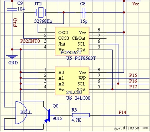 也许同学们已经注意到,我们给大家提供的这套最小系统电路板里,还有一些电路没给大家介绍,如由集成电路芯片U3(MAX3232)构成的通讯电路,由芯片U4(PCF8563T)和U5(24LC00)构成的I2C串行通信电路等(如图7和图8所示),这些严格说已不属于最小系统了,只是想尽可能多的把一些非常实用的电路放进来,方便大家的学习和实验。很遗憾,我们仍无法、也不允许把另外的许多电路容纳进来,如存储器电路、D/A、A/D转换电路、LCD液晶显示电路、LED矩阵显示电路、直流电机电路、步进电机电路、看门狗电路等,好在我们实验室有专门的实验箱,等大家入门后,这些专门的实验可在实验箱里做。补充说一句,U3构成的通讯电路,除可以做单片机和PC机的通讯实验外,也是我们以后做实验下载程序到单片机的重要通道(除用烧片机下载程序外)。