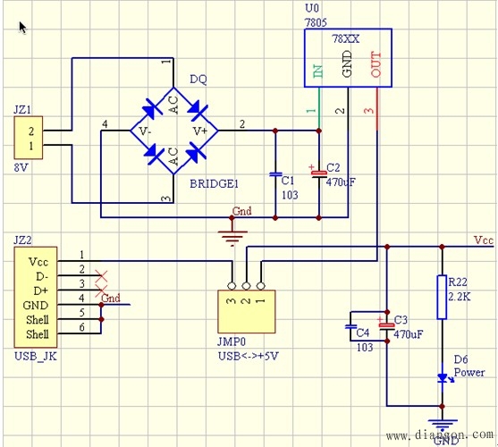 下边说一说本最小系统的电源电路,还是别具一格的,如图6所示。大家可看出,跳线排插JMP0是输入电源选择的必经之地,为方便大家做实验,当坐在计算机跟前时,可用USB连接线直接从电脑取5V直流电,这时只需将短路帽短路2、3脚,这也是以后大家做实验时主要的取电方法;也可另外用大于5V、小于12V的交、直流电源从电源插座JZ1输入电源,当然短路帽此时需短路1、2脚。