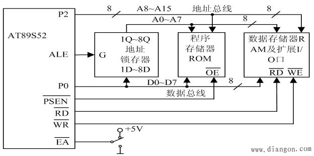 MCS-51系列单片机系统的扩展主要包括存储器的扩展和I/O口的扩展,图4为AT89S52单片机扩展后的结构框图。扩展能力为:
